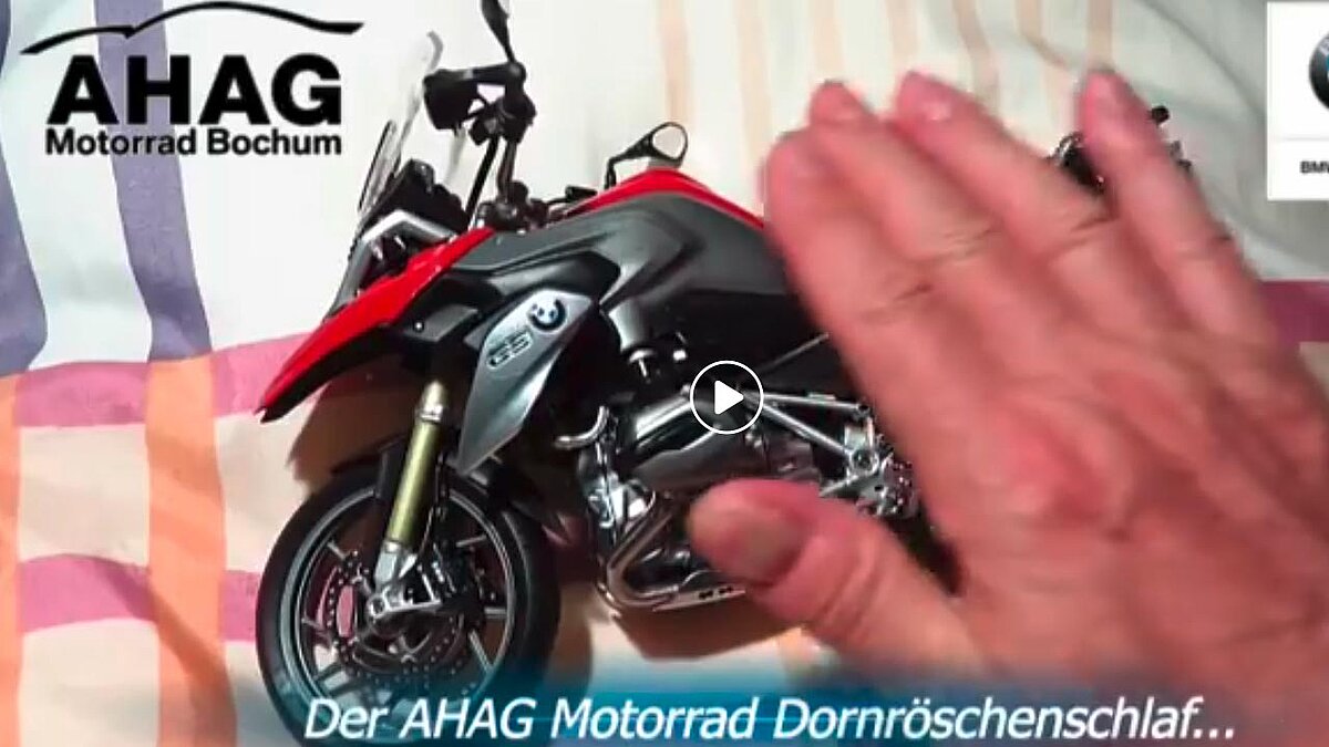 Die Äußerung eines Kunden, der mit Blick auf den bevorstehenden Winter zum Ausdruck brachte, dass er sein „Motorrad gerne zur Bettruhe bringen möchte“, setzte bei Wolfgang Hemstege, bei AHAG zuständig für das Themengebiet Marketing, das Kopfkino in Gang. Abends bei sich zu Hause schnappte er sich das naturgetreue Modell einer GS, das in seinem Regal parkte, packte es auf ein Kissen, baute seine Kamera auf und hatte nach ein paar Testeinstellungen schnell einen kompakten 15-Sekünder im Kasten. Im Filmchen zu sehen: Eine GS wird zu Bett gebracht, erhält noch einige Streicheleinheiten, bevor sie für den Winterschlaf zugedeckt wird. Dazu gab’s noch eine kurze Textzeile – und fertig war die Bewegtbild-Visualisierung des Wintereinlagerung-Services, den AHAG anbietet.