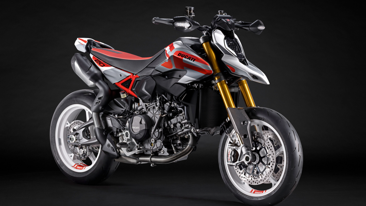 Die Hypermotard V2 SP präsentiert sich noch ausdrucksstärker – mit einem übergroßen Logo, das sich bis auf die Frontverkleidung erstreckt und im Kontrast zu den weißen Schmiederädern steht. Hinzu kommen markante Racing-Details wie das Carbon-Vorderradschutzblech, das goldene Öhlins-Fahrwerk und die Brembo-M50-Bremszangen. Neben ihrer speziellen Lackierung, die an das 20-jährige Jubiläum des ersten Prototyps erinnert, verfügt die Hypermotard V2 SP auch über eine technische Ausstattung, die den typischen Fun-Bike-Charakter der Hyper auf ein noch höheres Niveau hebt.
