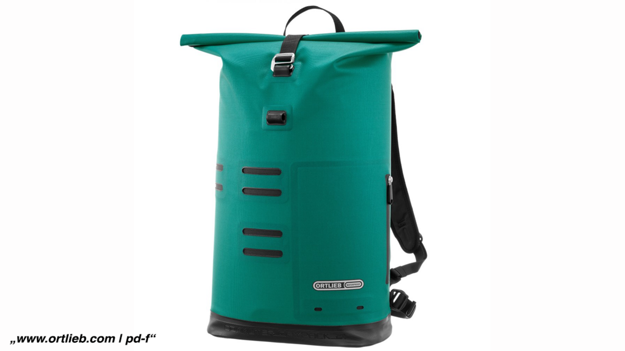 Ob Büro, Uni, Supermarkt oder Park – das „Commuter Daypack“ von Ortlieb in Atlantisgrün (UVP: 160 Euro) leistet für tägliche Radfahrten beste Dienste. Der robuste, wasserdichte Rucksack fasst 21 Liter und bietet über einen Rollverschluss Zugang zum Haupt- und Laptopfach. Die Träger sind ergonomisch geschnitten, die Rückseite gepolstert, was beim Fahrradfahren für hohen Tragekomfort sorgt.