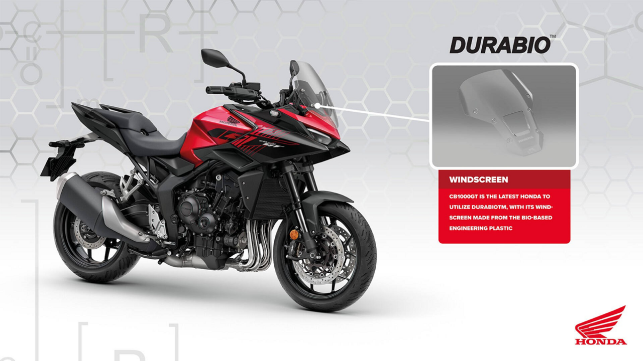 Die NC750X markierte einen weiteren Meilenstein in der Anwendung – als erstes Motorrad des weltgrößten Herstellers, bei dem farbiges DURABIO™ am Bodywork in den Farben Earth Black und Earth Ivy Ash Green zum Einsatz kam. Die soeben auf der EICMA-Messe vorgestellte CB1000GT (Modelljahr 2026) ist das neueste mit DURABIO™ ausgestattete Modell, denn auch hier ist die Verkleidungs-Windscheibe aus diesem Material gefertigt.