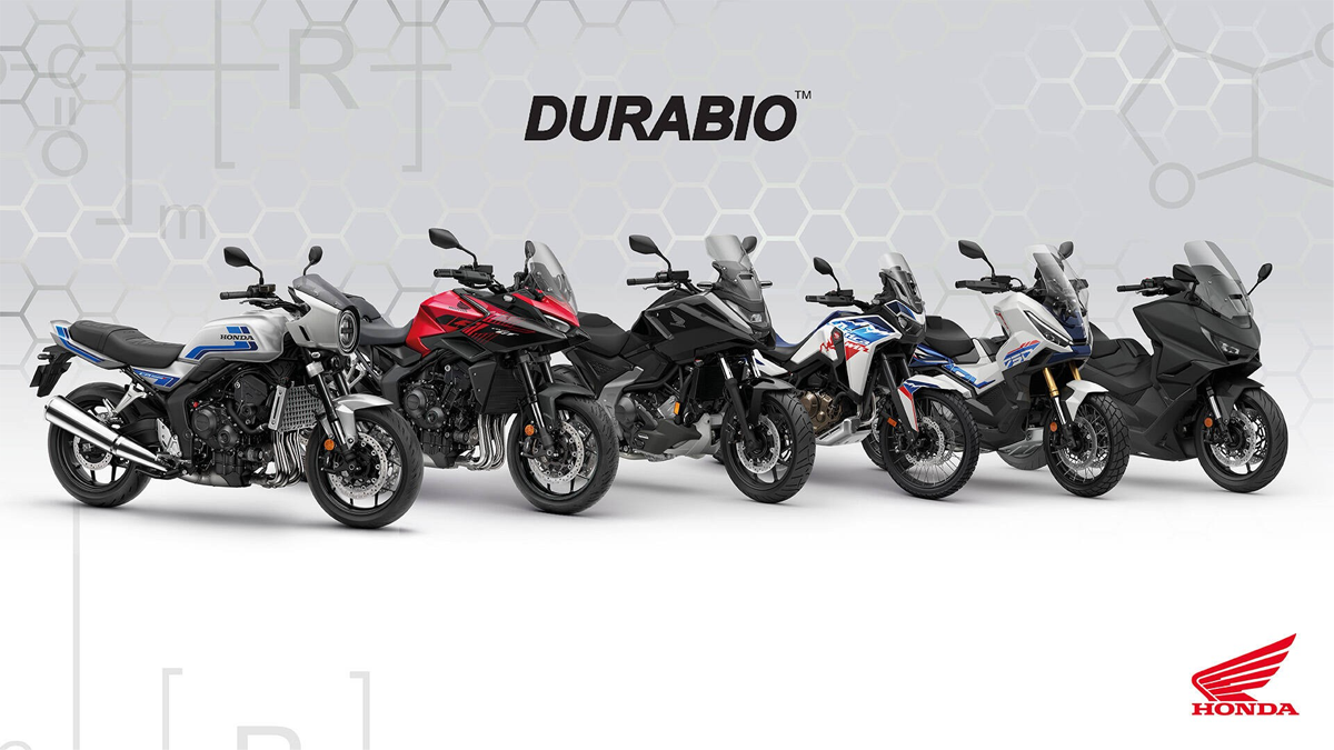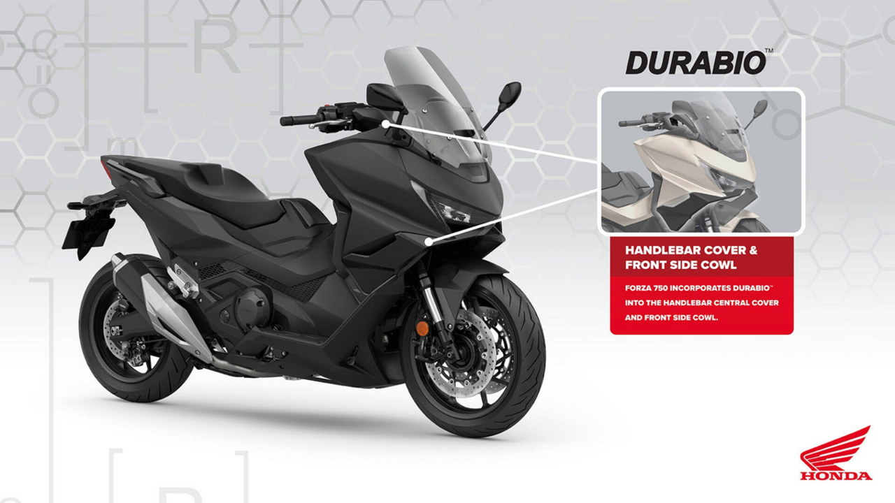 Honda verwendete DURABIO™ erstmals als Windscheibe beim Modelljahr 2024 der CRF1100L Africa Twin-Familie. Die weltweit erste Motorrad-Windscheibe aus biobasiertem technischem Kunststoff [5] sorgte für einiges Aufsehen. Darauf folgte der großvolumige ADV-Scooter X-ADV, bei dem DURABIO™ für seitliche Verkleidungsteile wie für die Windscheibe Verwendung findet. Parallel dazu werden am Scooter Forza 750 Lenkerverkleidung und vordere seitliche Verkleidungsteile aus dem neuen Material verbaut, welches sich auch dank der hochwertigen Verarbeitung nahtlos in die Umgebung mit anderen Materialien einpasst. Als Nächstes folgte die NT1100. Mit dem Facelift 2025 erhielt die beliebte Tourenmaschine eine neu gestaltete Frontverkleidung, die teilweise aus DURABIO™ besteht. Die aktuelle Modellreihe wurde mit der NC750X (Modelljahr 2025) komplettiert, die das moderne und nachhaltige DURABIO™ Material seither für Teile der Frontpartie, die Seiten- und Heckverkleidung sowie die Windscheibe verwendet.