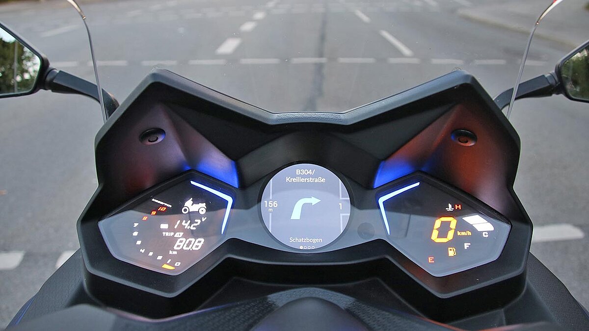 Kymco hat nach eigenen Angaben „einen ganz neuen Ansatz im Bereich der Navigation“ entwickelt: Die Benutzeroberfläche sei intuitiv designt, damit man mit einem einzigen kurzen Blick die Route erfassen könne. Der Fahrer müsse das Navi-Display deshalb nicht ständig im Blick haben – gut für die Fahrsicherheit. Wenn der Fahrer dann aber zum Beispiel an einer roten Ampel stehe und durchaus einen tieferen Blick riskieren könne, steuere die Noodoe-Navigation automatisch detailliertere Infos ins Display ein. Auch sehr praktisch: Das System merkt sich den aktuellen Parkplatz des Rollers. Über das Smartphone lasse sich das Fahrzeug dann leicht wiederfinden.