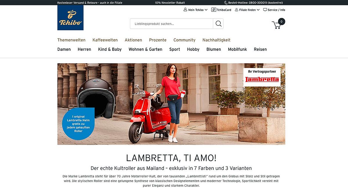 Die wöchentlich wechselnden Themenwelten sind ein erfolgreiches Kapitel im Tchibo-Marketing. In einer aktuellen Variante namens „La Dolce Vita“ mit italienischen Nonfood-Artikeln finden sich neben Pasta-Maschinen, Espressokochern und Pizza-Öfen auch Produkte, die erst auf den zweiten Blick zum Motto der Themenwelt, „Genießen wie in Bella Italia“, passen mögen: Roller des wiedererstandenen Herstellers Lambretta.