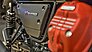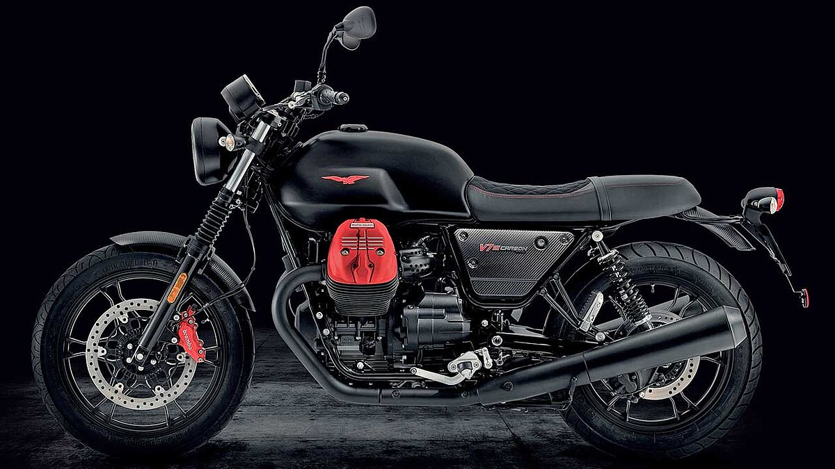Limitiert und nummeriert: Die V7 III Carbon kommt als „Limited Edition“, gründet im wesentlichen auf der aktuellen V7-Baureihe, trägt aber einige Bauteile, die man am Serienmodell so nicht findet: Etwa kurze Radabdeckungen und Seitendeckel aus Sichtkarbon, rotglänzend lackierte Brembo-Vierkolben-Bremssättel, satinierte, im Diamond Cut-Verfahren veredelte Zylinderkopfdeckel oder eine mit Alcantara bezogene und mit roten Nähten abgesteppte Sitzbank. Das Bike ist in Mattschwarz lackiert, auch Tankverschluss, Lampenring sowie die Abdeckungen der Einspritzdüsen und der hinteren Bremspumpe kommen in mattem Schwarz. Ein Hingucker ist der rote Adler, das Markenzeichen von Moto Guzzi, auf dem Tank.