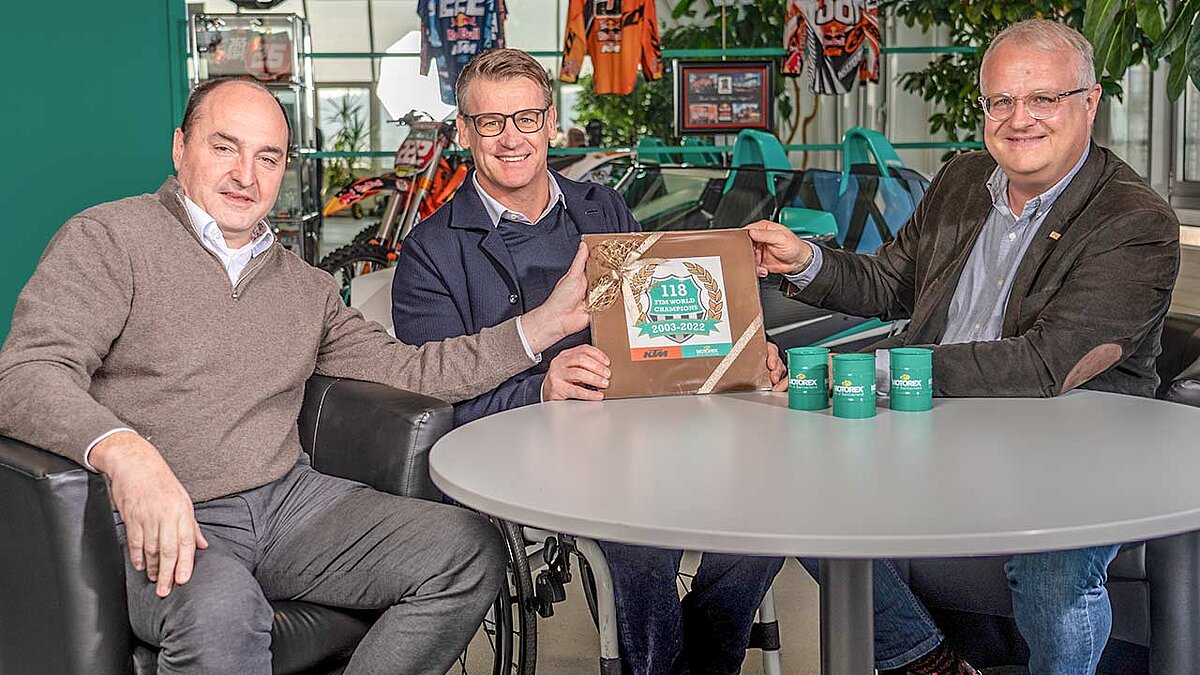 „Vertrauen und Verlässlichkeit sind essenzielle Werte in einer Partnerschaft. In 20 Jahren mit etlichen gemeinsamen Projekten für den Firstfill, die Serienfertigung, den weltweiten Aftermarkt und den Motorsport sind diese Werte gewachsen. Auch nach fast 120 Weltmeisterschaften und vielen Stunden des Hoffens, Zitterns und Daumendrückens an der Rennstrecke ist die Faszination der Zusammenarbeit unverändert. Beide Partner sind fest davon überzeugt, dass die Partnerschaft zwischen KTM und Motorex auch in Zukunft weitere interessante Ergebnisse bringen wird. Wir sind stolz darauf, auch in Zukunft einen Beitrag für die Erfolgsgeschichte der KTM Group zu leisten“, betonten Edi Fischer, CEO, und Ronald Kabella, Director Powersports der Motorex AG. Und KTM-Motorsport-Direktor Pit Beirer fügte hinz: „KTM und Motorex arbeiten auf dem Prüfstand der Motorradwelt großartig zusammen – die vielen Jahre und Titel sprechen für sich.“