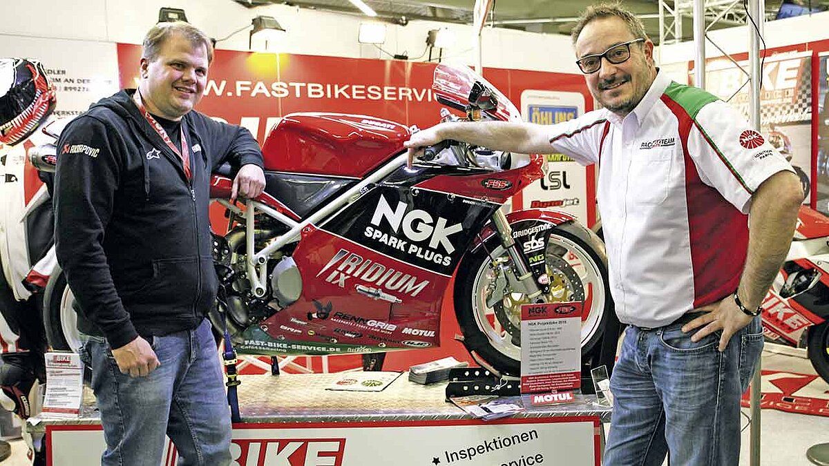 In Peter Sens, Verkaufsleiter Zweirad beim Zündkerzenhersteller NGK, fand er sofort einen Unterstützer für seine Projektidee. Denn Sens wiederum ahnte gleich: Das rote Bike und das NGK-Logo – das geht zusammen! Als Show- und Präsentationsbike könnte die rote Göttin durchaus gute Figur machen, dachte sich der NGK-Vertreter, als fahrende Markenbotschafterin die Message von NGK auf Messen und Veranstaltungen authentisch transportieren.