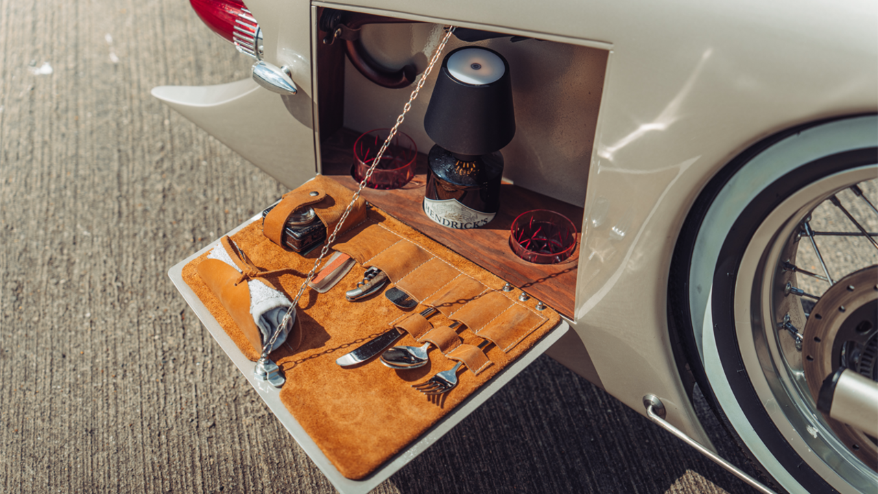 In Anlehnung an den Film “The Kingsman” verfügt das Motorrad über außergewöhnliche Details wie Spiegel, Kamm, Flaschenöffner, Flasche Gin, Flasche Tonic, Besteck und Regenschirm.