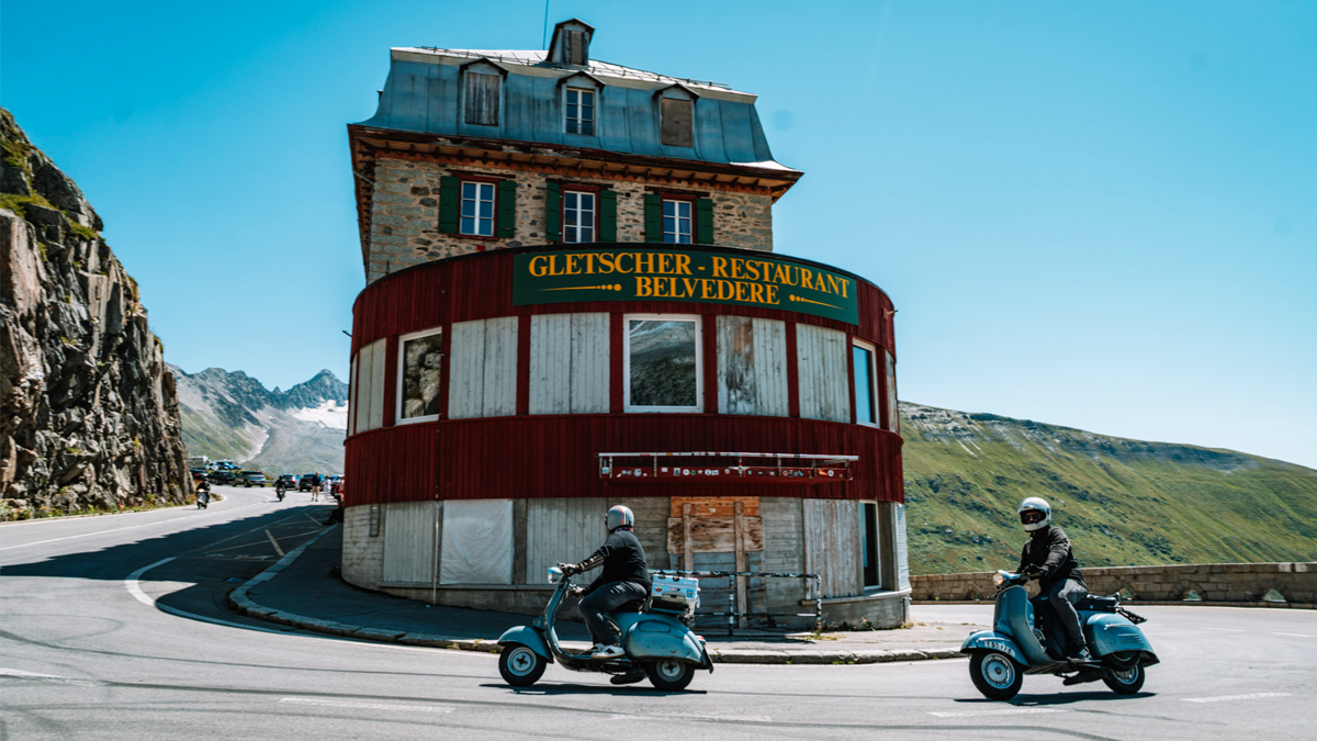 Am Abend verwandelte sich der Hauptplatz von Leuk in eine lebendige Vespa-Party, mal ruhig und gesellig, mal rockig und ausgelassen – stets mit einem besonderen Gemeinschaftsgefühl und einem kühlen Getränk in der Hand, wie bei einem großen Familienfest. Der nächste Morgen führte über den Grimselpass (2.165 m) und den Sustenpass (2.260 m) vorbei am Vierwaldstättersee. Von Horgen aus ging es per Fähre über den Zürichsee.