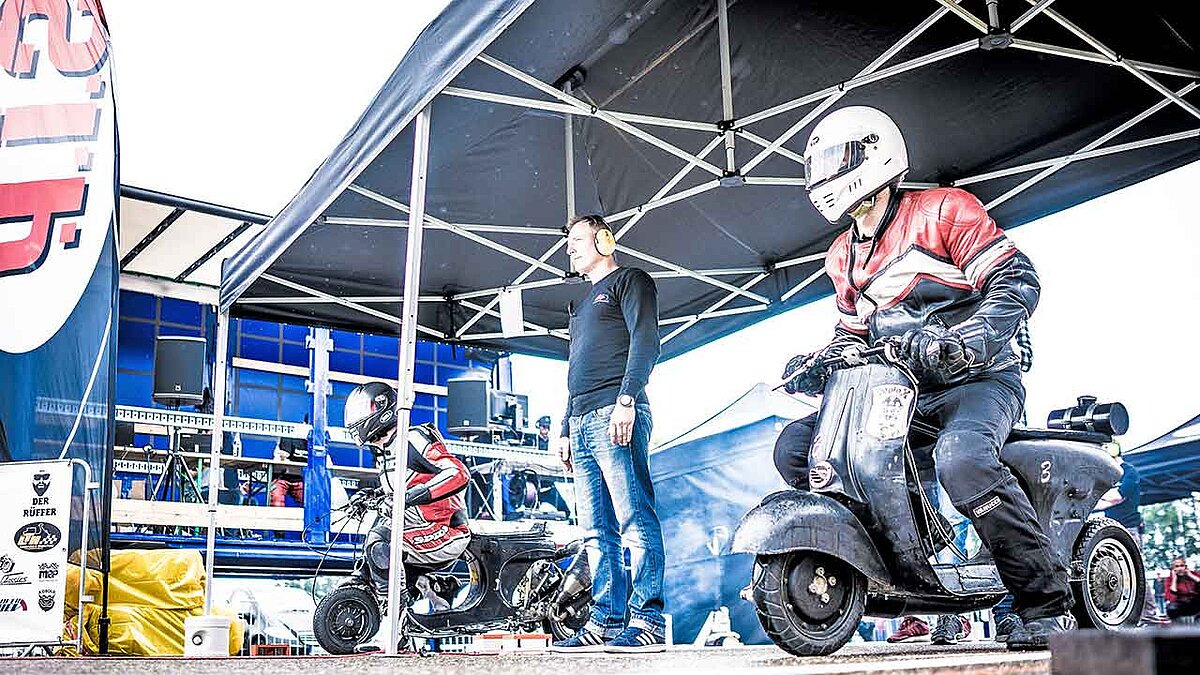 „Tacho Karacho“ hieß das Event vor den Toren des ausgewiesenen Scooterspezialisten und Betreibers des Portals www.sip-scootershop.com. Das im Mittelpunkt des Geschehens stehende Beschleunigungsrennen über 150 Meter, zu dem ausschließlich Schaltroller zugelassen waren, zählte gleichzeitig als Wertungslauf für die Deutsche Blechroller-Meisterschaft (DBM) und lockte am 21. Juli die Tuner- und Fahrerszene aus dem ganzen Bundesgebiet nach Oberbayern. Und die nutzte nicht nur die Gelegenheit zum Besuch des SIP-Leistungsprüfstands, auf dem der Rekordhalter des Tages eine Vespa mit satten 62 PS war. Die Szene traf auch auf echte Rennatmosphäre: Hannes Bichteler von Sport1 moderierte die Geschehnisse stilecht, über große LED-Displays gab’s für die Zuschauer Infos über die Rennergebnisse in Echtzeit. Auch wenn man es im deutschen Rekordsommer 2018 kaum glauben mag: Aber Regenwetter setzte der Veranstalter stellenweise etwas zu.