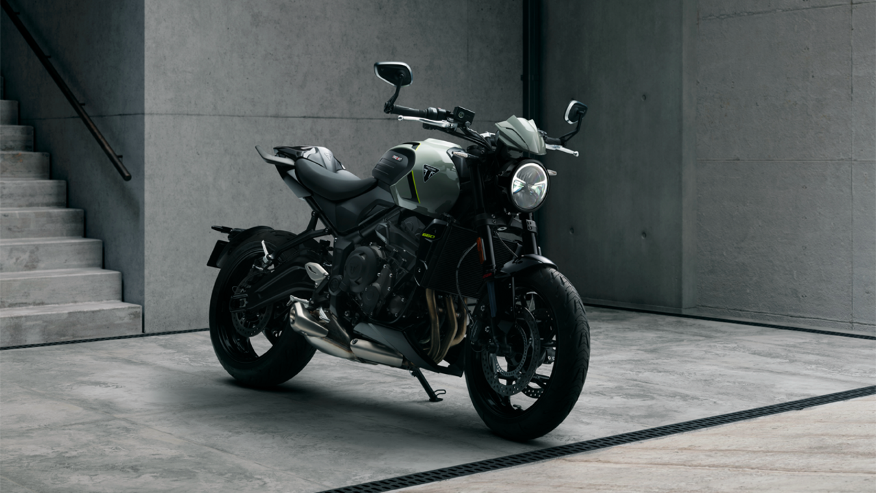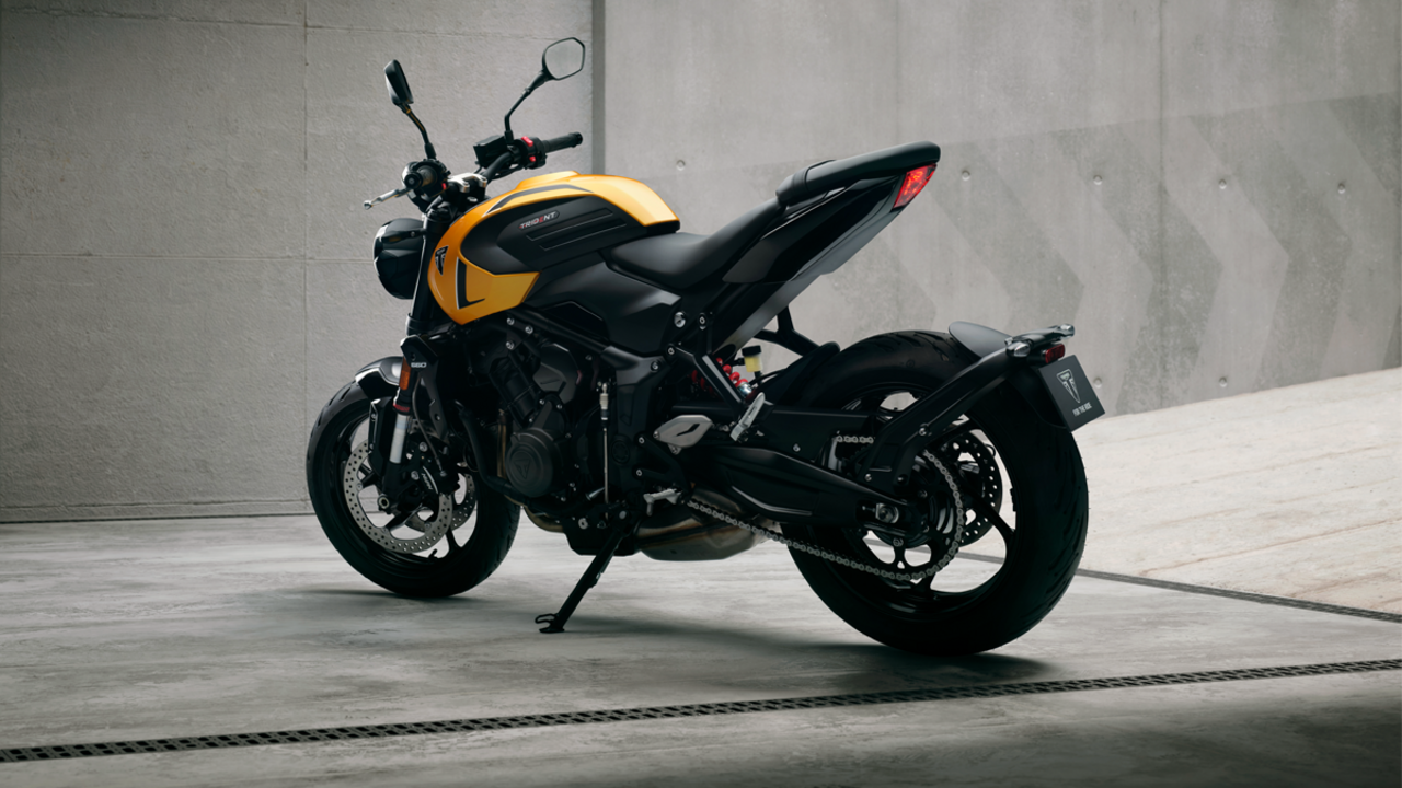 Wie beim Trident: drei 44-mm-Drosselklappen, größere Airbox, überarbeiteter Zylinderkopf, neue Motorabstimmung, +20 % Drehzahl auf 12.650 U/min. Dreizylindersound bleibt charakteristisch. Überarbeitetes Abgassystem, Triumph Shift Assist, Slip & Assist-Kupplung, A2-Kit verfügbar.