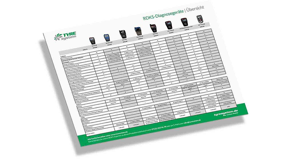 Die Übersicht für RDKS-Programmiergeräte steht ab sofort unter www.tyresystem.de/vergleich1217 kostenlos zum Download bereit. Mehr Hilfe zum Thema RDKS erhalten Interessierte am Expertentelefon unter 07122/8259378 oder per E-Mail unter rdks@tyresystem.de